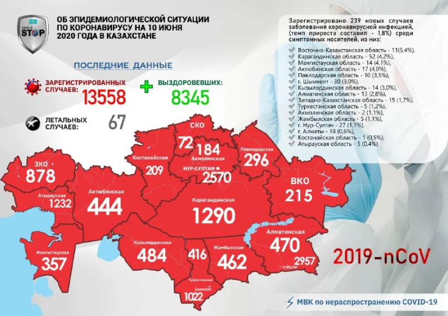 Всего на 10 июня 2020 года в Казахстане подтверждено 13558 случаев коронавируса среди симптомных носителей, выздоровело 8345 заболевших пациентов, умерли 67 человек.