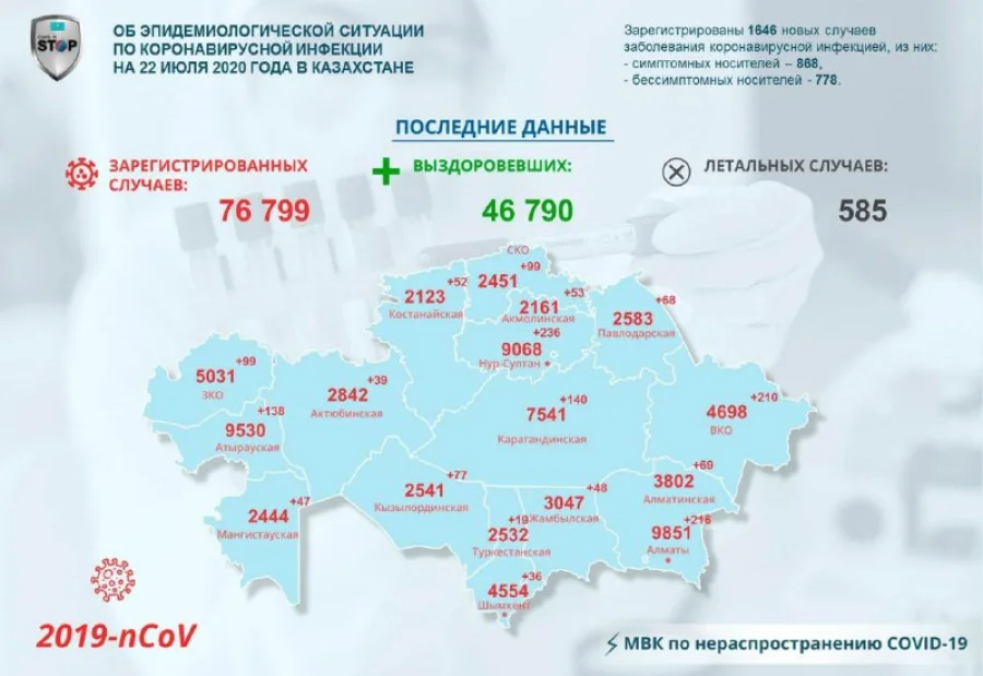 Всего на 22 июля 2020 года в Казахстане подтверждено 76799 случаев, из них: в городе Алматы — 9851 (+216), в Атырауской области — 9530 138), в городе Нур-Султан — 9068 (+236), в Карагандинской области — 7541 (+140), в ЗКО — 5031 (+99), в ВКО — 4698 (+210), в городе Шымкент — 4554 36), в Алматинской области — 3802 69), в Жамбылской области — 3047 48), в Актюбинской области — 2842 (+39), в Павлодарской области — 2583 68), в Кызылординской области — 2541 (+77), в Туркестанской области — 2532 19), в СКО — 2451 (+99), в Мангистауской области — 2444 (+47), в Акмолинской области — 2161 (+53), в Костанайской области — 2123 (+52) человека.