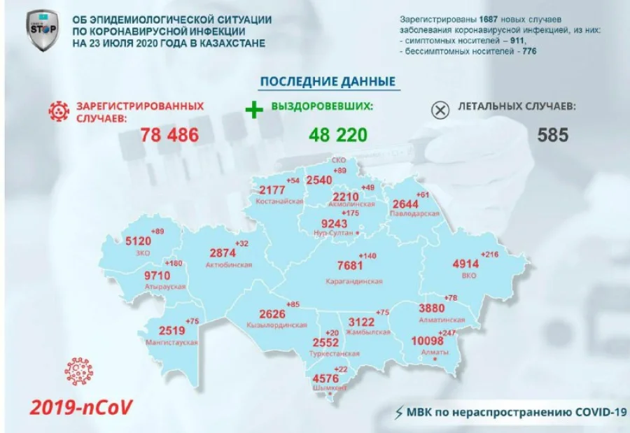 Всего в Казахстане по состоянию на 23 июля подтверждено 78486 случаев коронавирусной инфекции.
