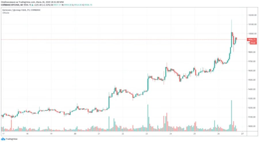 Днем 26 июля около 13 часов по московскому времени курс биткоина резко дернулся вверх, впервые со 2 июня прорвав уровень 10 тысяч долларов. На некоторых биржах цена успела подняться до 10,2 тысячи долларов. Но как и двумя месяцами ранее, за рывком последовал откат до 9,8 тысячи долларов, после чего курс стабилизировался чуть выше 9,9 тысячи долларов.