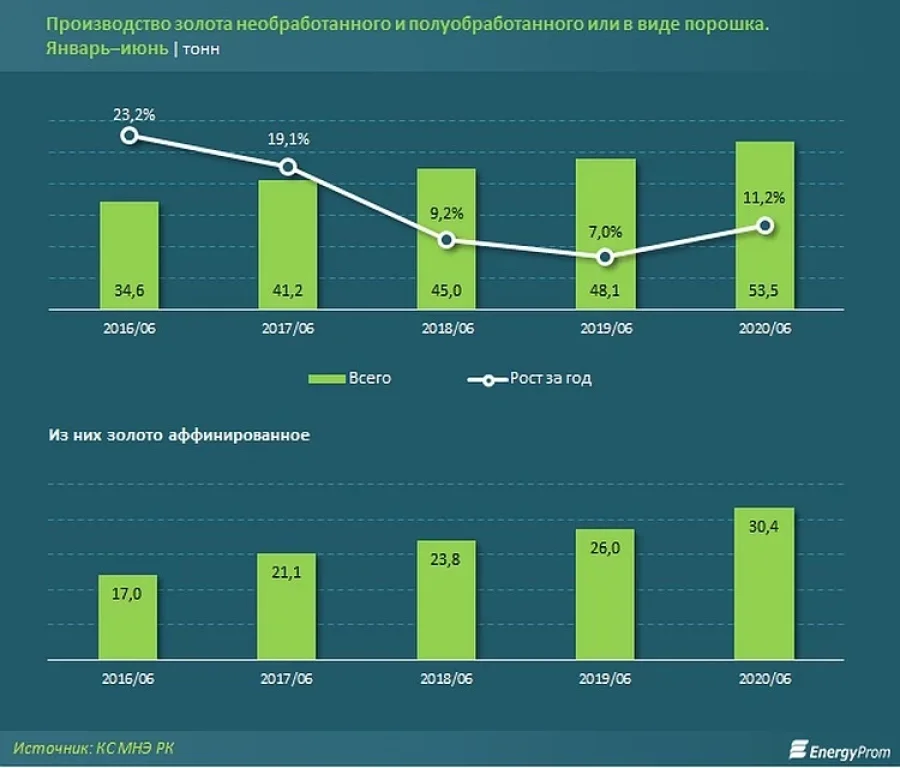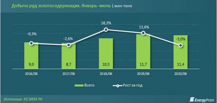 В январе–июне 2020 года добыча золотосодержащих руд в стране составила 11,4 миллиона тонн — на 3% меньше, чем годом ранее. В аналогичном периоде прошлого года было добыто 11,7 миллиона тонн руд.