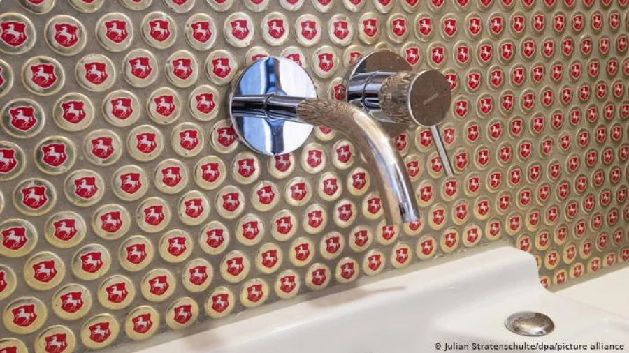 Стены в ванной комнате облицованы крышками от пивных бутылок