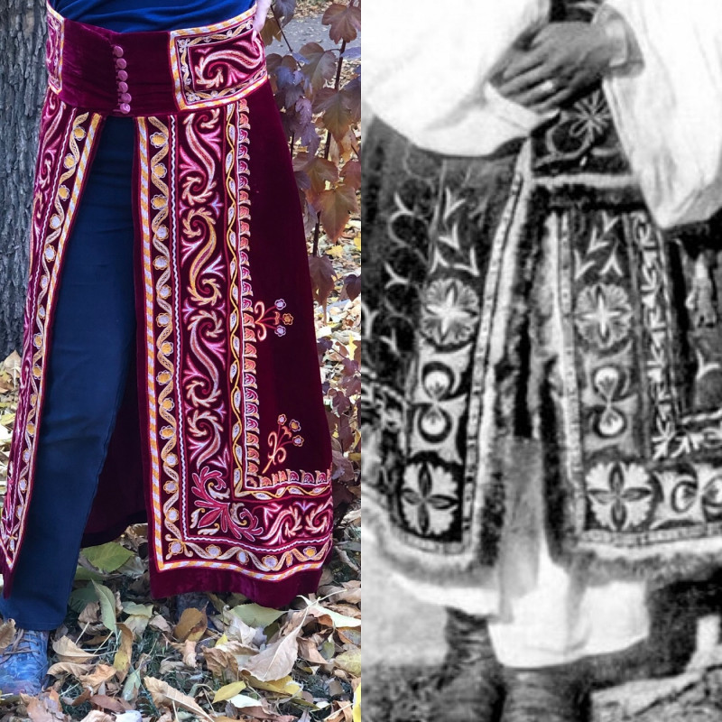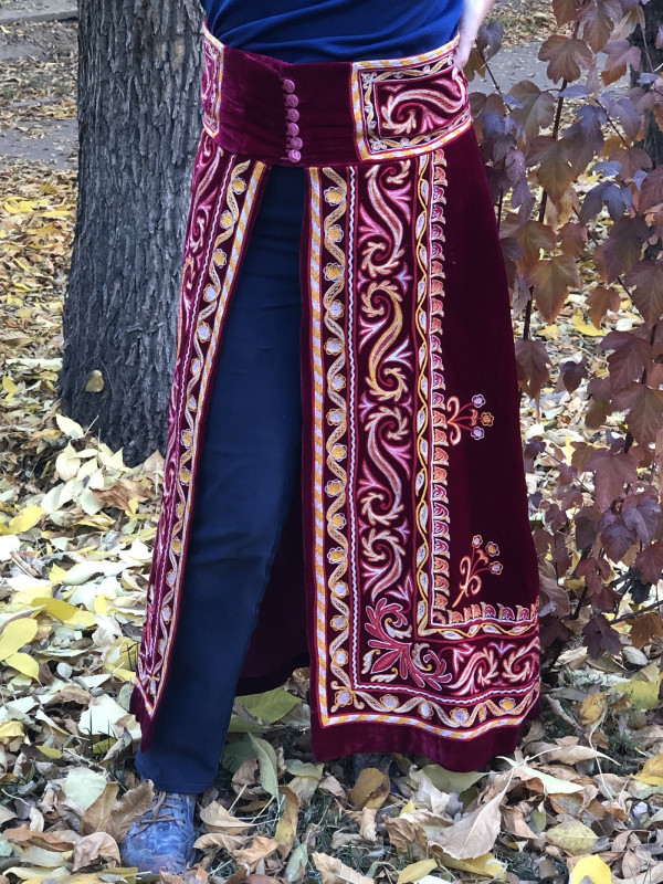 И она придумала простой и гениальный способ (или первый шаг на пути?) возрождения старинной казахской юбки: заказала ее для себя у замечательных народных мастериц — вышивальщицы Кулжай Кусман и портнихи и войлочницы Ауэс Сагинаевой. В качестве «прототипа» была выбрана белдемше из Южно-Казахстанского музея: ее фасон, ее орнамент, только цвет ткани было решено поменять на насыщенный бордовый.