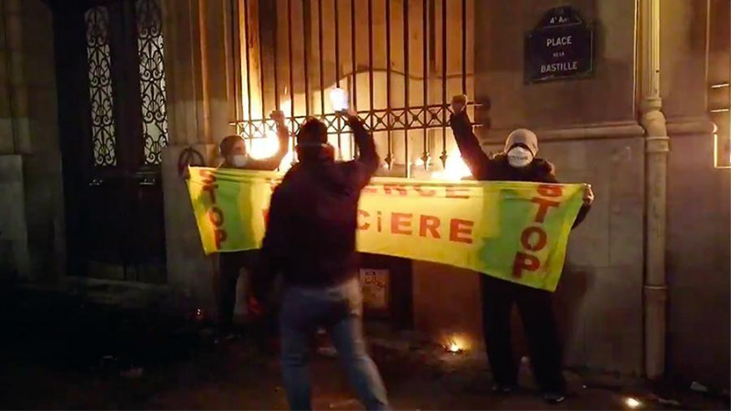 La fachada de la sede del banco de Francia está en llamas en la Place de la Bastille. Continúan las protestas por la ley de seguridad global y por el ataque de policías a un productor negro.