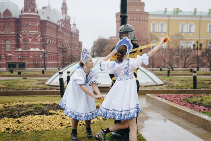 Pussy Riot провели новую акцию против полицейского насилия «Осторожно, хрупкое!». Они привязали «омоновца» к столбу возле Кремля