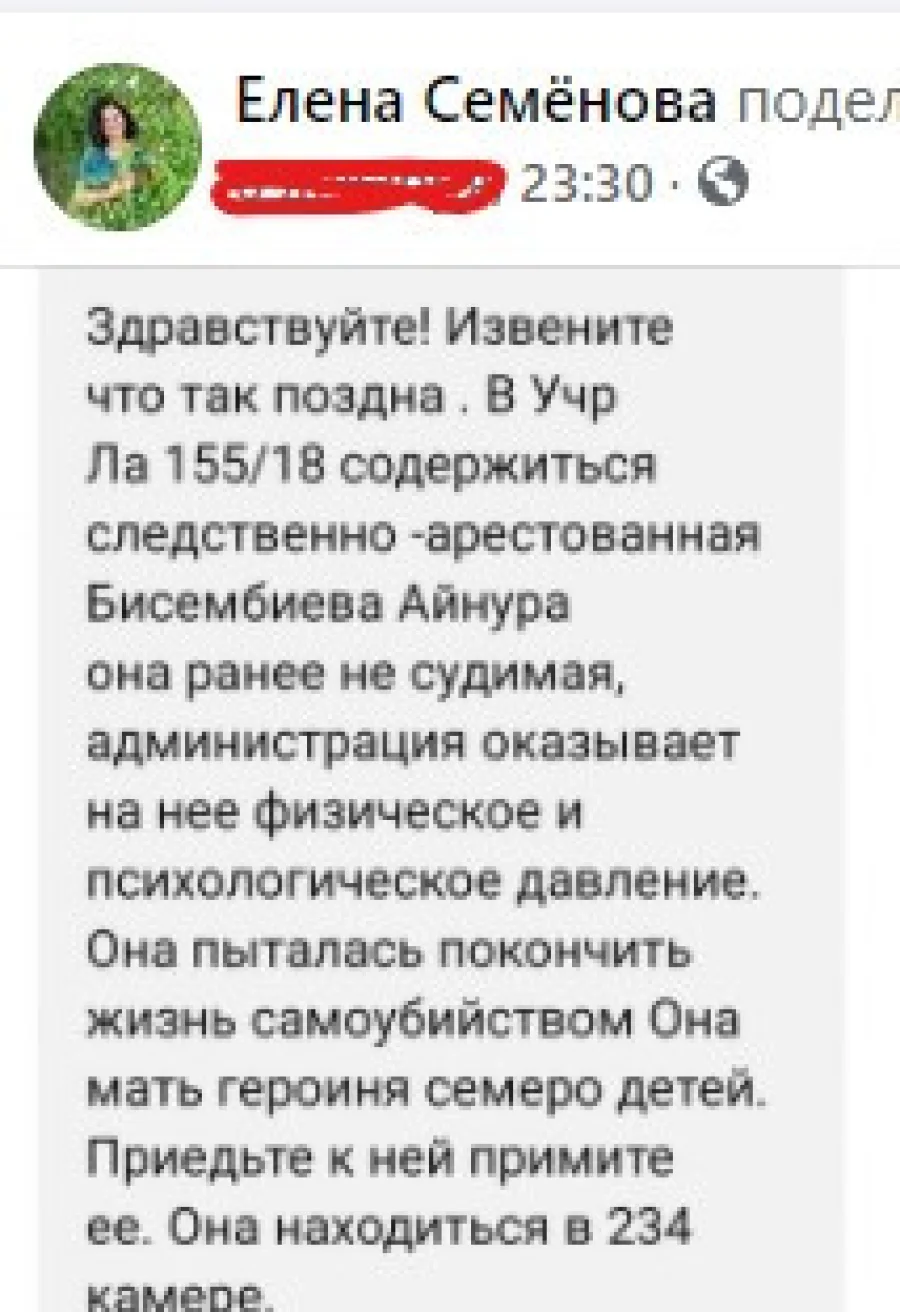 Информация о том, что якобы многодетная мать пыталась покончить с собой в следственном изоляторе Алматы из-за психологического давления, появилась в соцсетях.