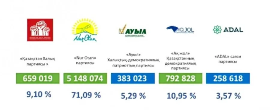 Правящая партия Казахстана Nur Otan набрала более 71,09% на выборах в парламент, «Ак жол» — 10,95%, Народная партия Казахстана — 9,1%, передает VRK.News.