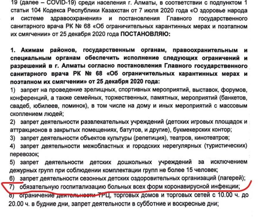 Такое решение содержится в очередном постановлении №2 от 28 января 2021 года главного санитарного врача Алматы Жандарбека Бекшина, которое и стало главным новшеством. Теперь, согласно пункту седьмому данного постановления, в Алматы будут госпитализировать всех больных COVID-19, вне зависимости от формы заболевания — легкой, средней или тяжелой.