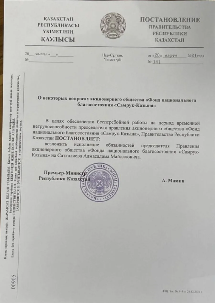 Между тем, согласно документу, на его место назначен Алмасадам Саткалиев, который ранее занимал позицию управляющего директора «Самрук-Казына».