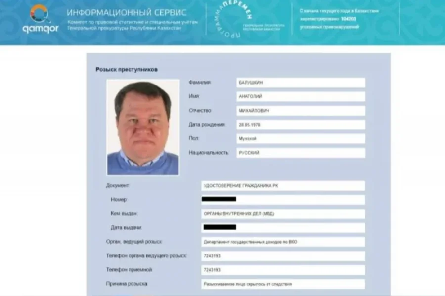 Согласно данным, Балушкин скрылся от следствия. А ищет его департамент государственных доходов Восточно-Казахстанской области.