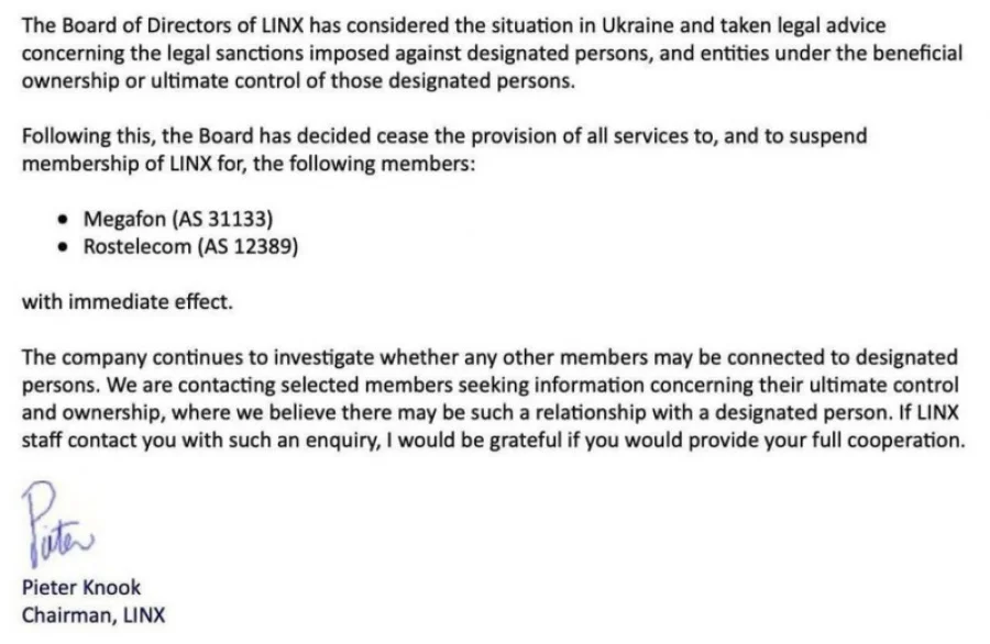 Письмо, как отмечает Хабр, предназначено для внутренней рассылки клиентам LINX. В нем говорится, что решение уже вступило в силу, и что LINX продолжит проверку в отношении других российских клиентов, которые могут быть связаны с владельцами «Мегафона» и «Ростелекома». Другими крупными клиентами LINX являются «Вымпелком», МТС и «ТрансТелеКом».