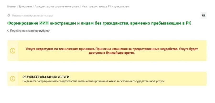При попытке заказать получение ИИН онлайн на сайте Egov.kz стала появляться следующая информация: «Услуга недоступна по техническим причинам. Приносим извинения за предоставленные неудобства. Услуга будет доступна в ближайшее время«.
