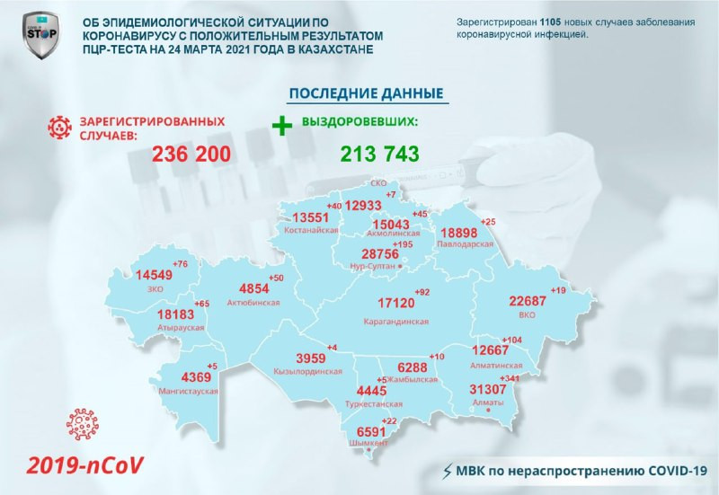 За прошедшие сутки в Казахстане выявлено 1105 заболевших с положительным ПЦР на коронавирусную инфекцию, передает VRK.News со ссылкой на сайт Coronavirus2020.kz.