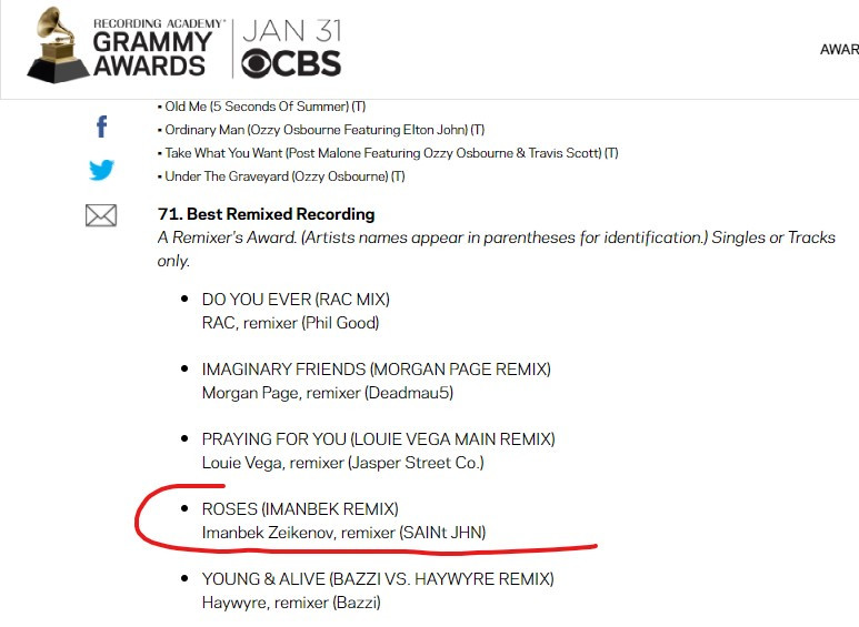 Желаем нашему соотечественнику победы в самой престижной премии в музыкальной индустрии, а с учётом взрывного стриминга «Roses», уверены, что победа уже в кармане павлодарского самородка.