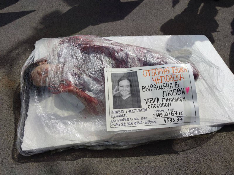 Причём, особо активные митингующие даже устроили некий перформанс. Девушку уложили на "тарелку" и завернули в пищевую плёнку, подписав: "Этот человек был выращен в любви и забит гуманным способом". Таким образом, митингующие призывают казахстанцев отказаться и от потребления мяса.