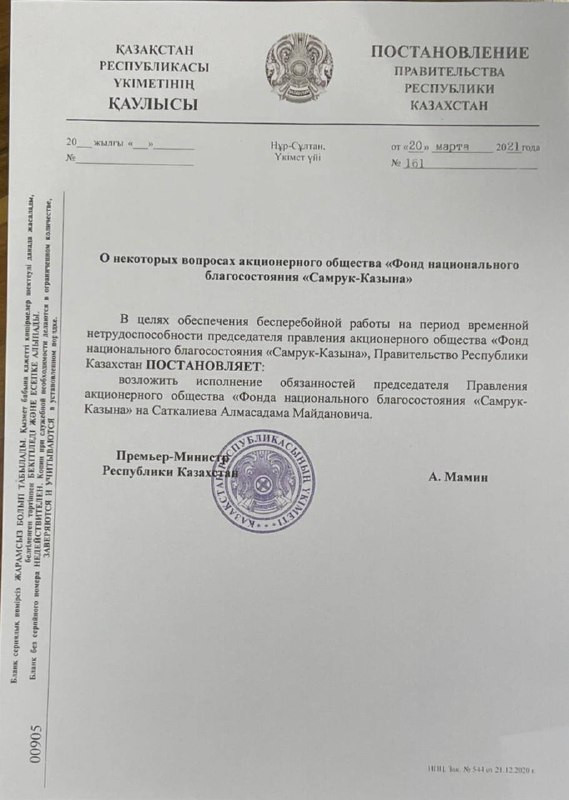 Сакен Сарсенов, ранее занимавший пост председателя правления АО «Казпочта», освобождён в связи переходом на другую работу.