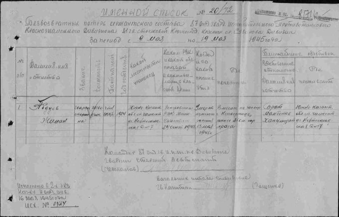 По ее словам, документы указывают на то, что в могиле лежит мужчина из Южно-Казахстанской области (ныне Туркестанской – ред.) из города Шымкент. Был прописан по адресу: Нефтескладская дом № 7, на фронт ушел в 1941 году. Погибшего зовут Жиман Абдуев. Он был разведчиком. В этой местности оказался во время освобождения Праги. Был ранен 9 мая, скончался 13 мая 1945 года. Ему был 21 год. В документе о его смерти указан ближайший родственник – брат Хажумурат Мамбетов с тем же адресом прописки.