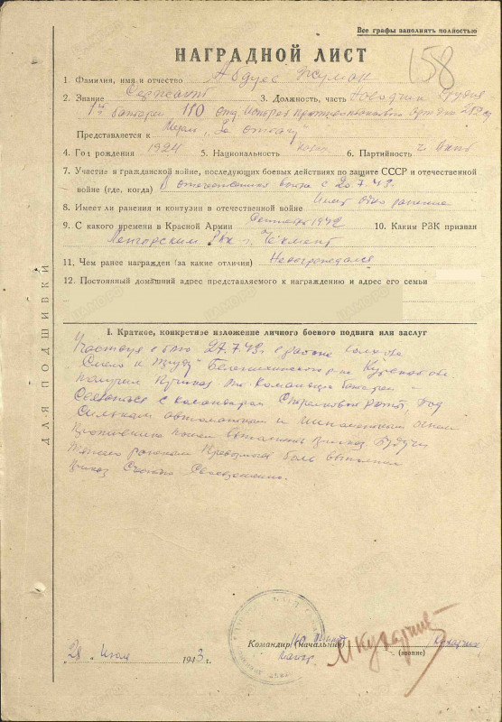 Ирина стала искать дальше и нашла документ о награждении Абдуева. Но вышла заминка: в свидетельстве о смерти написано, что его зовут Жиман, а в документе о награждении - Жулан. Так вот, Жулан Абдуев в 1943 году получил медаль "За отвагу". До этого медалями не награждался.