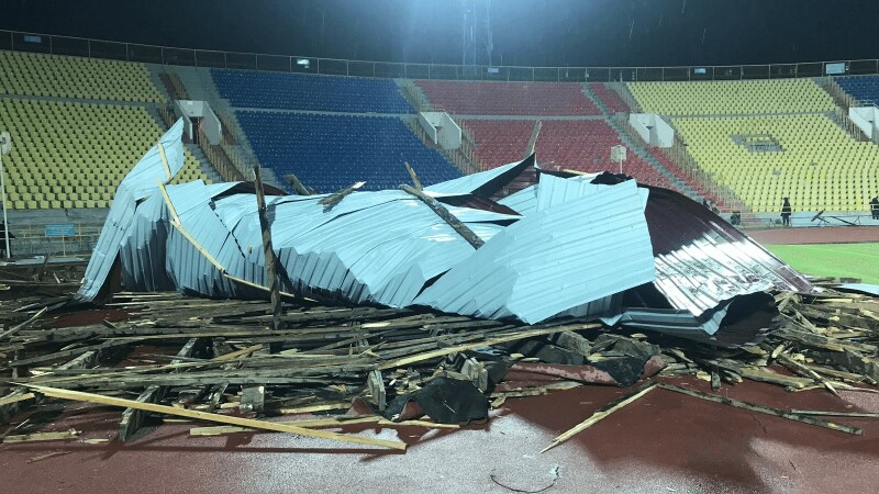 Порывы ветра достигали 20 метров в секунду, из-за чего и случился срыв кровли (площадью около 400 квадратных метров) основного здания стадиона.